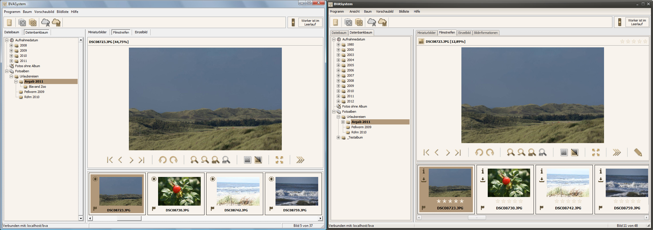 Zusätzlich konnte ich den Werkzeugkasten mit 3 Werkzeugen (Lupe, Navigation und Histogramm) implementieren. Außerdem ist es jetzt möglich, die hierarchielosen Schlagworte nachträglich durch die Schlagwortkategorien mit einer Hierarchie zu versehen. Dadurch entsteht eine weitere Ansicht auf die Datenbank und soll das Auffinden von Bildern vereinfachen. Die Vollbildansicht wurde optisch überarbeitet und auch an der Bildinformationsansicht wurde weiterentwickelt. Bereits Anfang des Jahres wurde die Routine zum Laden der Miniaturbilder überarbeitet. Es werden nur noch die Miniaturbilder im Speicher vorgehalten, die auch zur Anzeige benötigt werden.